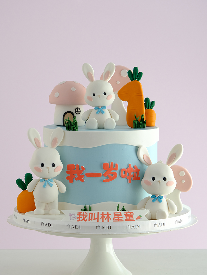 The cake was given by Chinese parents to the little angel who turned 1 year old. Delicately decorated by artist MaDi with images of mother rabbit, third rabbit, and baby rabbit always together