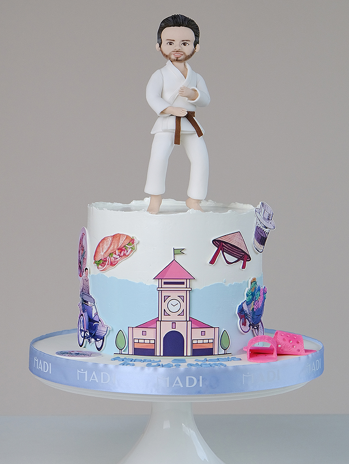 Cream cake is shaped with martial artists and honeycomb sandals, special interests of the boss. The image of the boxer with a white uniform, brown belt shows a resilient, strong but still simple and warm man with close honeycomb sandals.