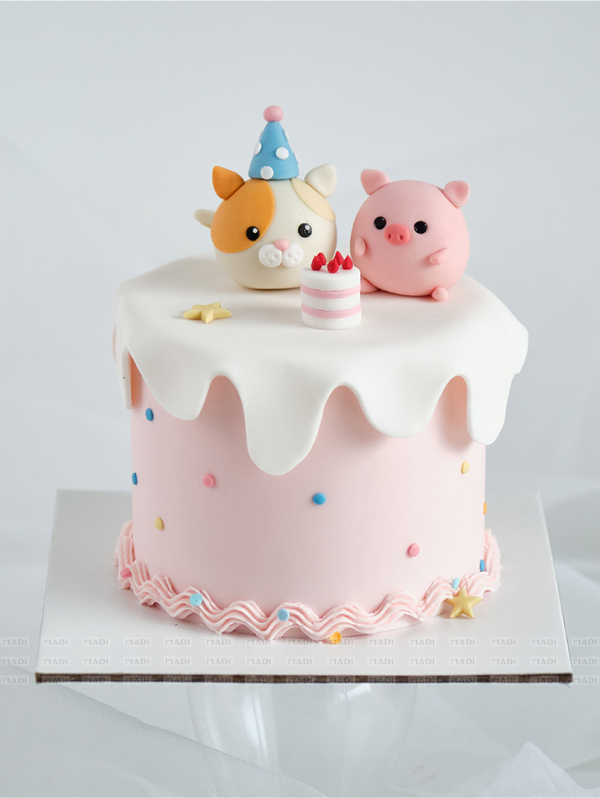The cake is simple but the highlight lies in the pig and cat shaped vividly and lovingly. With unique features and round facial features. Every detail on the cake shows the sophistication and special care from artisan MaDi. Create a bright and vibrant picture at birthday, first month, and first birthday parties for children.