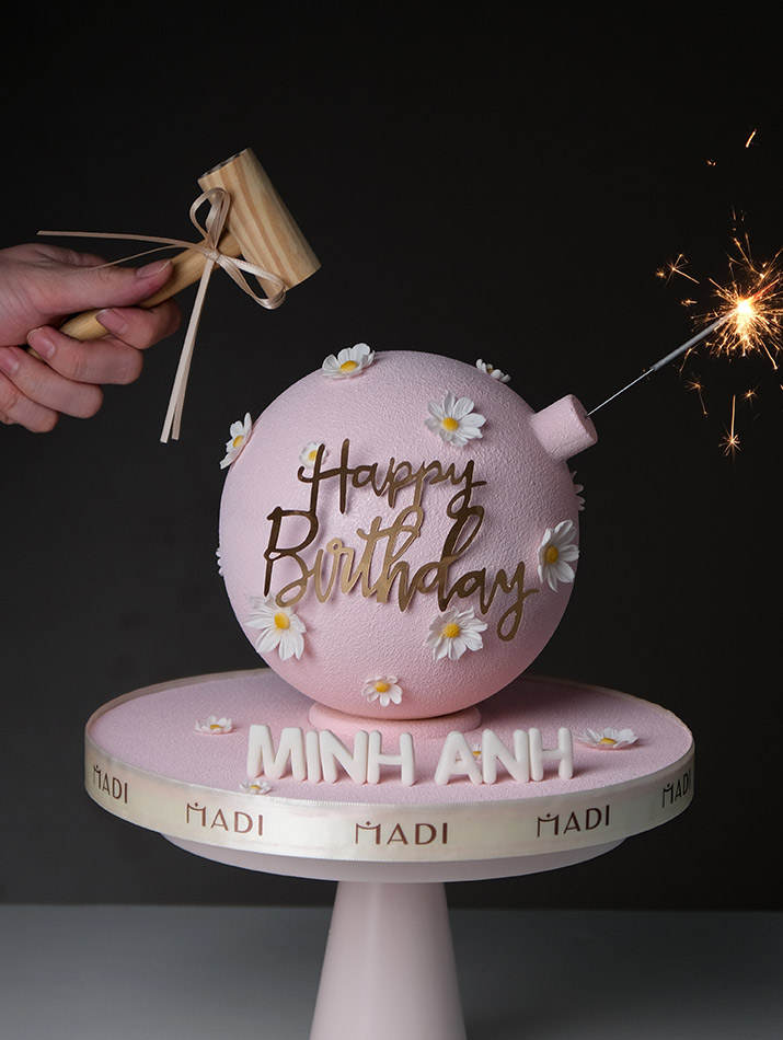 Bánh đập Pinata Hoa cúc là sự kết hợp hoàn hảo giữa vẻ đẹp thanh lịch và sự độc đáo. Với lớp vỏ tròn màu hồng pastel dịu nhẹ, trang trí bằng những bông hoa cúc trắng tinh tế, bánh mang thông điệp chúc mừng “Happy Birthday” nổi bật ở trung tâm.