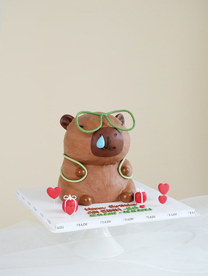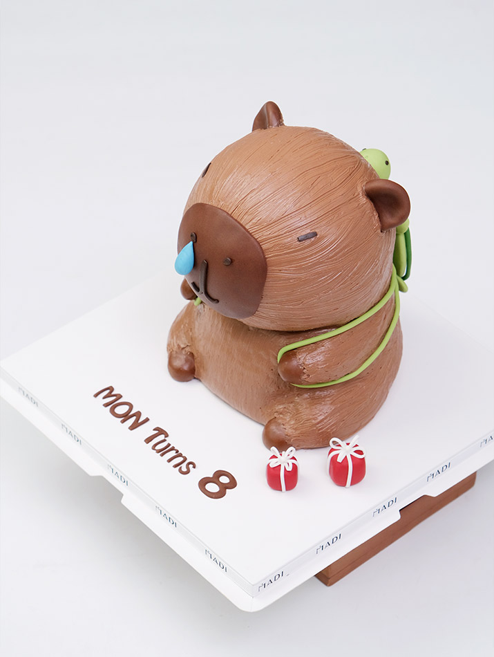 Đôi tai tròn, gương mặt ngộ nghĩnh và giọt nước mắt mũi hóm hỉnh, chiếc bánh capybara của Tiệm Bánh MaDi mang đến một vẻ ngây ngô dễ thương khó thể cưỡng lại. Cùng với chiếc balo nhỏ màu xanh nhạt tạo hình chú rùa con nằm gọn gàng trên lưng, càng làm tăng thêm sự đáng yêu và tinh nghịch cho chú capybara.