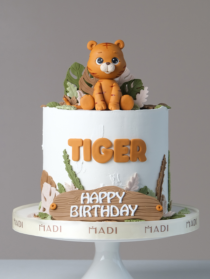 Chiếc bánh kem đầy tháng dành cho bé tuổi Hổ được MADI thiết kế theo concept chú hổ con giữa rừng xanh. Nghệ nhân làm bánh nhà MADI đã dùng fondant để tạo nên một tác phẩm tỉ mỉ đến từng chiếc lá, vân gỗ và ánh mắt thơ ngây của chú hổ con đáng yêu. Nhân bánh là sự kết hợp giữa những lớp bánh chocolate mềm mịn và lớp chocolate ngọt ngào. Tất cả tạo nên một chiếc bánh kem có một không hai dành cho con bạn.