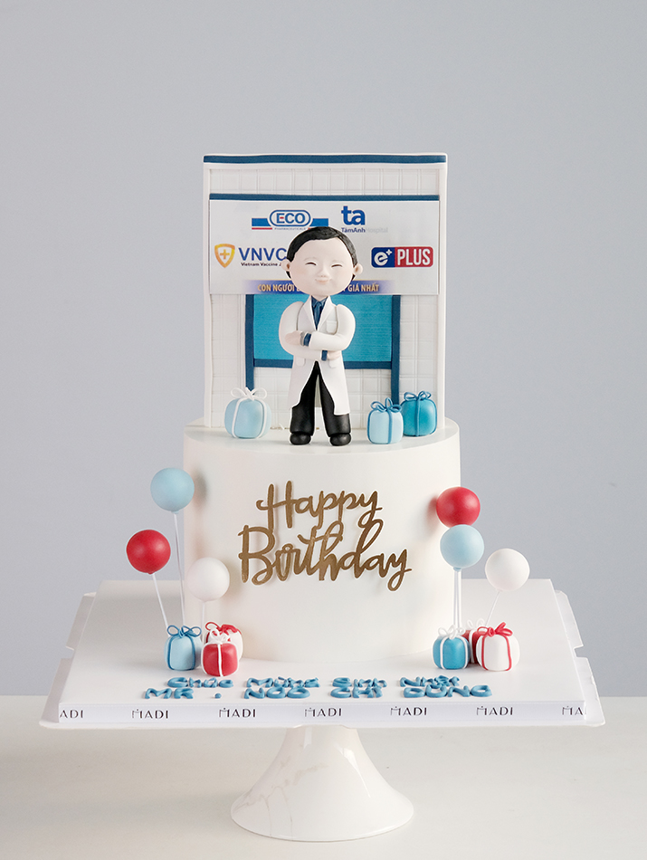 Trên nền bánh là hình ảnh tập thể lớp Khoa Sản A, với các thầy cô và học sinh tươi vui, đoàn kết bên nhau. Những họa tiết trang trí tinh xảo, như khuôn mặt mỗi người, biểu tượng của ngành Y, càng khiến chiếc bánh trở nên sống động và đầy ý nghĩa.