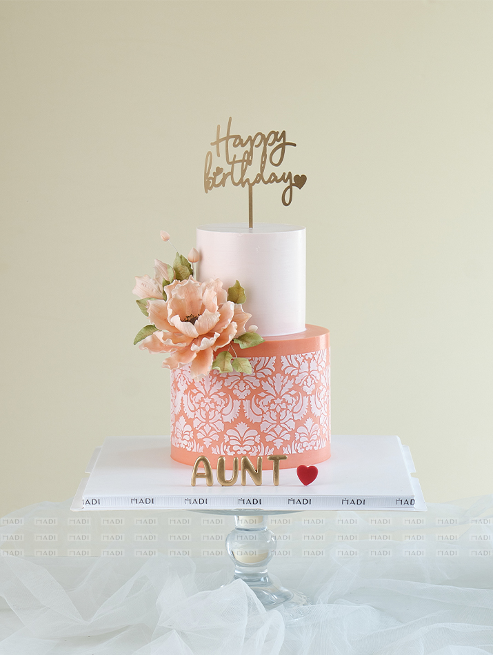 Chiếc bánh sinh nhật hai tầng nổi bật với hoa hải quỳ tạo hình tinh xảo, kết hợp hoạ tiết ren nổi sang trọng trên nền cam pastel ngọt ngào tại MaDi
