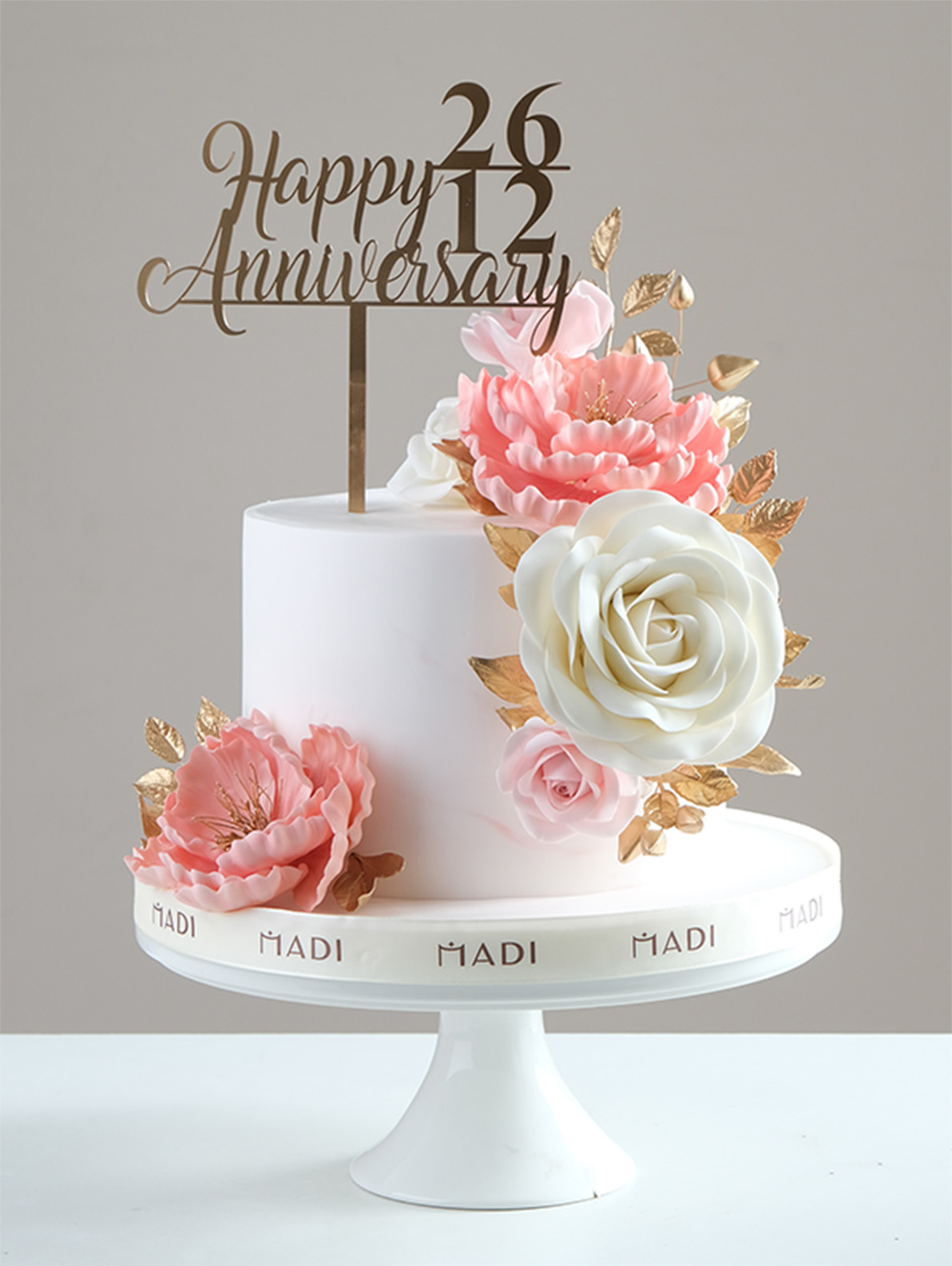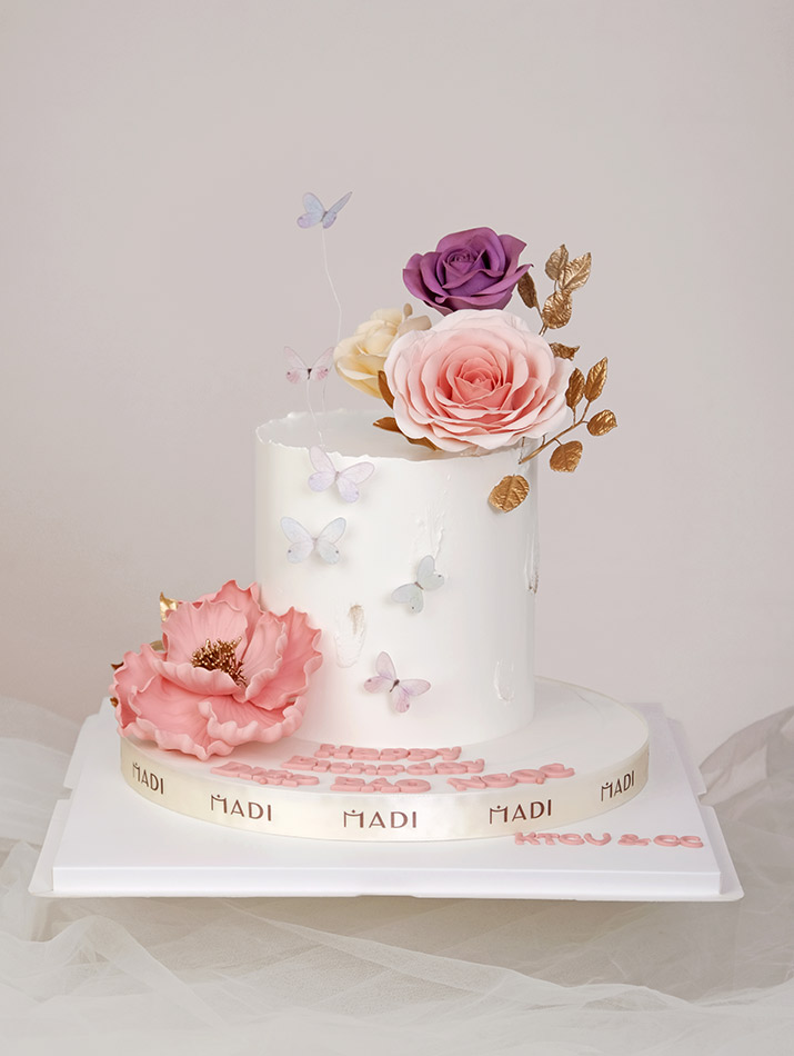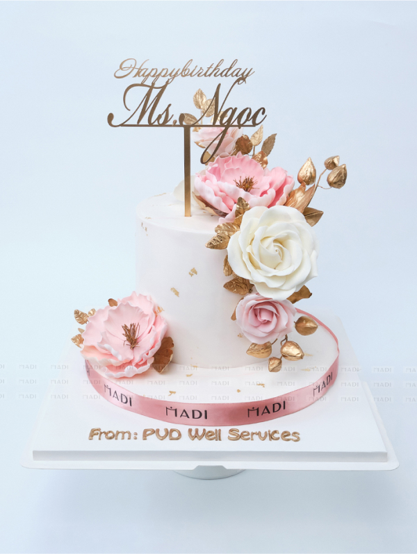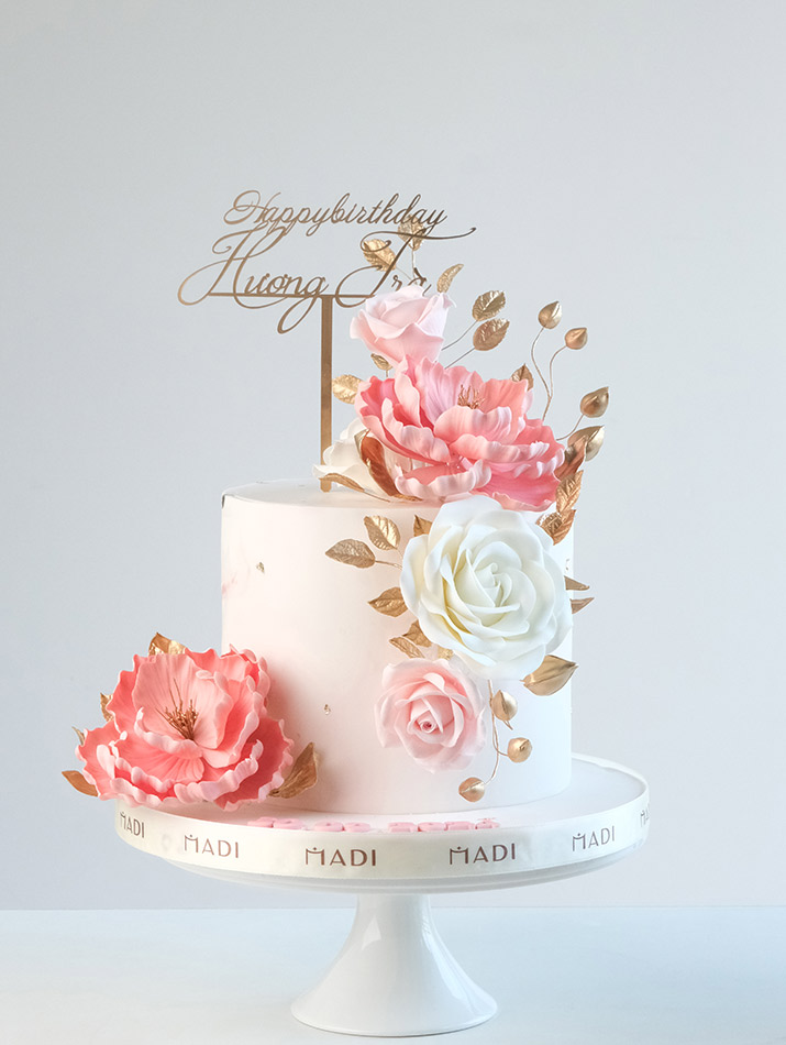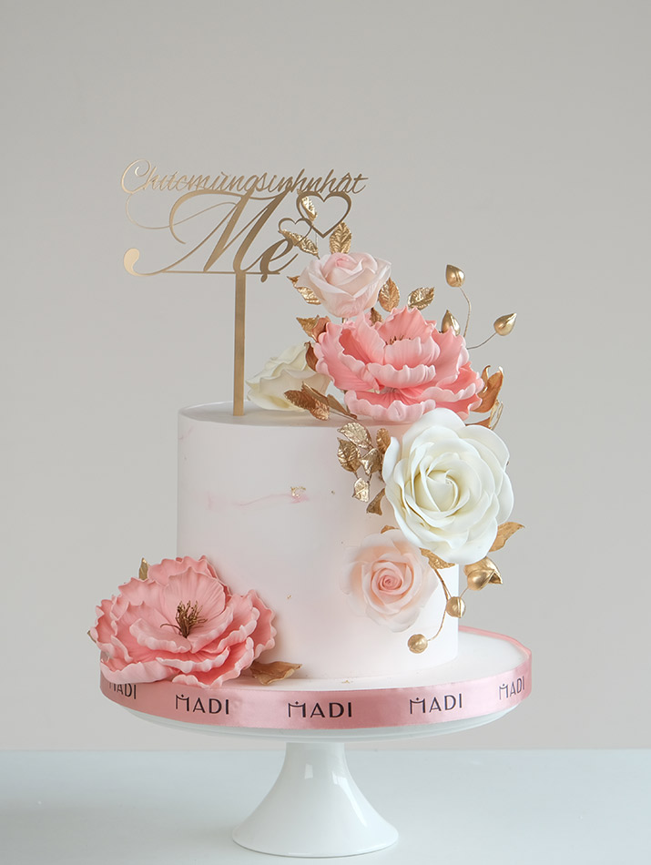 Chúc mừng sinh nhật Madam Thu. Chúc quý cô luôn xinh đẹp như những đóa hoa và tự tin tỏa hương khoe sắc. Đóa hoa hồng thanh tao, trang nhã; hoa mẫu đơn tượng trưng cho sự tôn vinh, giàu sang và phú quý. Nghệ nhân làm bánh nhà MaDi đã khéo léo tạo nên những cánh hoa mềm mại, uyển chuyển từ lớp fondant sắc sảo, ngọt ngào. Nhân bánh Red Velvet đỏ tươi và creamcheese thơm béo chắc chắn sẽ làm cho người thưởng thức bánh thêm ngất ngây và mê hoặc.