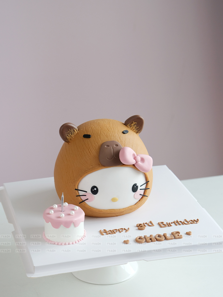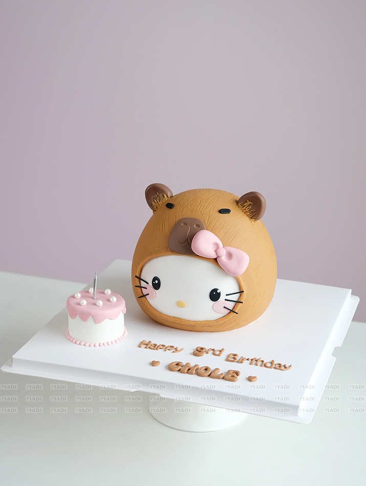 Sự kết hợp đầy sáng tạo giữa bé mèo Hello Kitty đáng yêu và chú Capybara hiền hòa, chiếc bánh chắc chắn sẽ mang đến niềm vui bất ngờ và trở thành điểm nhấn ấn tượng cho bữa tiệc sinh nhật đặc biệt của bé Chloe.