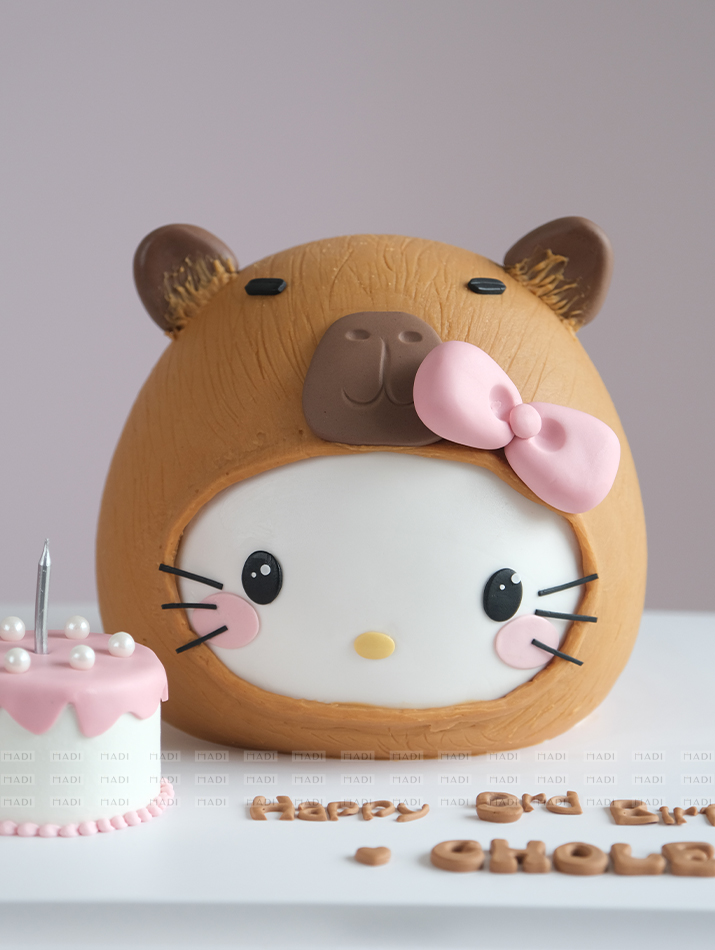 Bánh sinh nhật Hello Kitty được thiết kế đáng yêu với hình dáng độc đáo, kết hợp giữa Hello Kitty và trang phục Capybara màu nâu xinh xắn.
