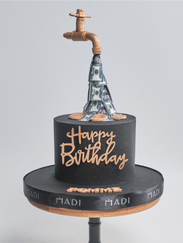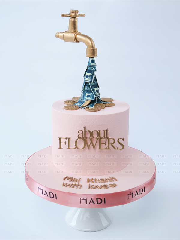 Mẫu bánh kem Phát Tài là mẫu bánh độc đáo được nghệ nhân nhà MADI lấy cảm hứng từ câu “Tiền vô như nước” để trang trí chiếc bánh bằng lớp fondant. Hình ảnh những tờ tiền đang chảy ra từ vòi nước tạo nên nét độc lạ và ấn tượng cho chiếc bánh. Bên trong là những lớp bánh vani hạnh nhân cam mềm mại hòa quyện cùnng với cream cheese béo ngậy, làm tăng thêm hương vị hấp dẫn cho chiếc bánh.