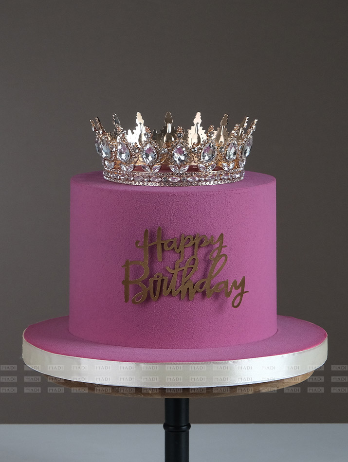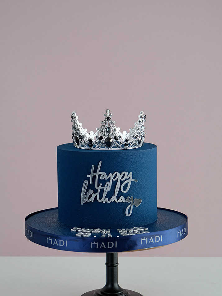 Bánh sinh nhật cho nữ sang trọng với thiết kế tối giản nhưng đầy cuốn hút. Phần bánh màu xanh đậm nhã nhặn được làm nổi bật bằng chiếc vương miện lộng lẫy ánh vàng đặt trên đỉnh, mang đến vẻ đẹp quý phái và đẳng cấp tại MaDi