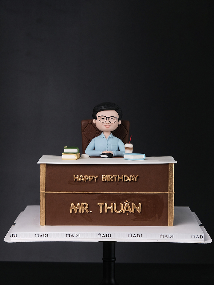 Trên nền bánh từng chi tiết tạo hình đều là thói quen hằng ngày của anh. Tạo hình chibi của anh – với bộ dáng quen thuộc, tay lên bàn, đeo kính, ngồi trên chiếc ghế tựa êm ấm. Những chi tiết như cà phê, sách, hộp iPod 2 trên bàn càng làm tăng thêm nét đặc trưng của anh.