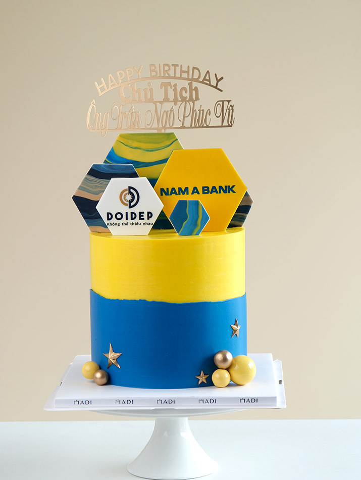 Chiếc bánh kem tặng sếp được thiết kế sang trọng và tinh tế, với màu sắc chủ đạo xanh-vàng nổi bật, kết hợp biểu tượng thương hiệu ấn tượng tại MaDi