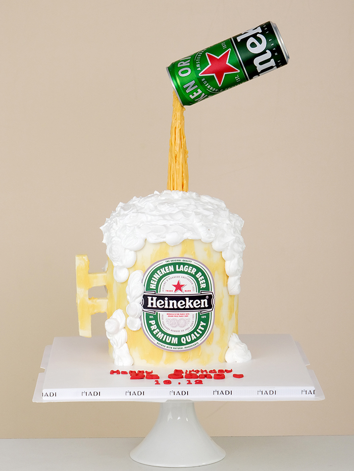 Chiếc bánh kem Bia Heineken mới lạ dành tặng cho những người bạn hay rủ đi nhậu sẽ tạo ra một sự bất ngờ đầy thú vị trong bữa tiệc. Nghệ nhân làm bánh nhà MaDi đã lấy ý tưởng từ khoảnh khắc rót bia tràn ly tạo thành bọt bia trắng xóa để tạo nên chiếc bánh kem độc đáo này. Bạn sẽ không phải say vì đắng mà sẽ đắm chìm trong hương vị ngọt ngào của ly bia khổng lồ này.